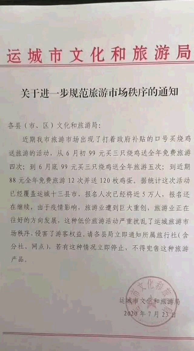 近期,運(yùn)城市旅游市場(chǎng)出現(xiàn)了打著政府補(bǔ)貼的口號(hào)買燒雞送旅游的活動(dòng),從6月初99元買三只燒雞送全年免費(fèi)旅游四次;到6月底99元買三只燒雞送全年旅游五次;到近期88元全年免費(fèi)旅游12次并送120枚雞蛋。該通知還稱,據(jù)統(tǒng)計(jì),這次活動(dòng)已經(jīng)覆蓋運(yùn)城十三縣市,報(bào)名人次已經(jīng)將近5萬(wàn)人,報(bào)名還在繼續(xù),由于疫情影響,旅游業(yè)遭到巨大重創(chuàng),旅游業(yè)正在往好的方向發(fā)展,這種低價(jià)旅游活動(dòng)嚴(yán)重?cái)_亂了運(yùn)城旅游市場(chǎng)秩序,侵害了游客權(quán)益,請(qǐng)各縣局立即通知所屬旅行社(含分社、網(wǎng)點(diǎn)),若有這種情況立即停止,不得兜售這種旅游產(chǎn)品。