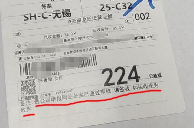近期有用戶反映收到來自安徽蕪湖的快遞件(順豐和京東),信件到付35元,信件備注中寫著:貴公司申報網站備案已通過審核,請簽收,如拒收視為放棄。該郵件為詐騙行為,近期完成備案審核的用戶請不要支付、簽收!