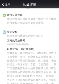 微信認證成功后,公眾帳號資料中“認證詳情”中會展示認證資料、以及微信認證特有的標識,暫不支持取消。