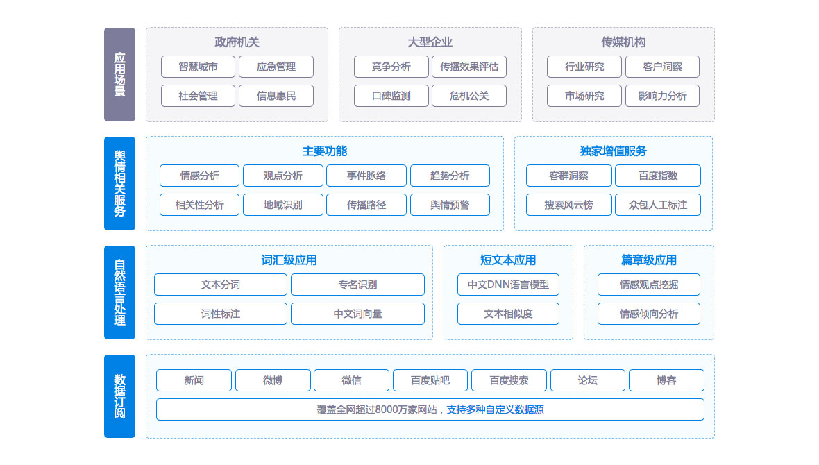 海量數據的積累與大數據分析處理能力,為政府、廣電媒體、輿情服務商、企業提供實時輿情數據訂閱、智能語義分析、百度搜索指數及全網用戶畫像等功能,幫助客戶實現個性化深度定制輿情分析,把握時事脈搏。