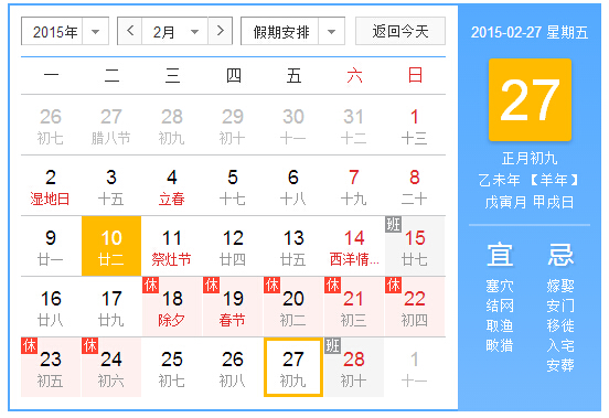 2015年春節:自2月14日至2月26日,放假13天。2015年2月27日 正月初九 (星期五)照常上班。
