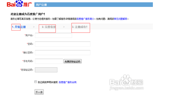 由上圖我們可以看到需要注冊一個(gè)推廣賬號,那么我們就開始注冊填寫推廣賬號首先我們需要點(diǎn)擊1 注冊百度推廣,就會看到下面的頁面,詳情看下面的頁面一步步的有提示來完成我們的百度推廣賬號注冊服務(wù)