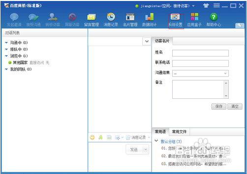 通過上面我們就可以完成一半的工作了,下面開始安裝我們提前下載好的百度商橋3.0安裝完后下面就可以看到如下的界面填寫上你剛才注冊好的賬號和密碼。我們點(diǎn)擊登錄就可以登錄我們的百度商橋了,登錄后的界面如下,我們會在下面做一系列的操作,很簡單,跟我來做吧。首先我們需要點(diǎn)擊的是系統(tǒng)設(shè)置這個(gè)選項(xiàng)如下