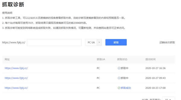 每個站點每周可使用70次,抓取結果只展現百度蜘蛛可見的前200KB內容。