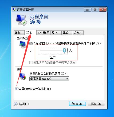 2、在出現的窗口中切換到“顯示”選項卡,將“顯示配置”一欄中的導航條拉到最右邊,即全屏模式,確定即可,相關截圖如下所示:
