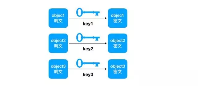 BOS服務(wù)端加密使用對(duì)稱(chēng)加密算法AES256加密數(shù)據(jù),對(duì)稱(chēng)加密算法使用同樣的密鑰加密和解密數(shù)據(jù)。為了提高數(shù)據(jù)安全性,我們對(duì)每個(gè)Object使用不同的密鑰加解密,獨(dú)立的密鑰可以極大地提高用戶數(shù)據(jù)的安全性,舉例說(shuō)明,我們可以把每個(gè)Object文件看成一個(gè)箱子,文件的內(nèi)容就是箱子里的物品,為了防止箱子里的物品被盜,我們可以對(duì)箱子上鎖,類(lèi)似執(zhí)行加密操作,用鑰匙開(kāi)鎖相當(dāng)于對(duì)文件進(jìn)行解密操作。多個(gè)Object文件使用相同的密鑰相當(dāng)于多個(gè)箱子的鎖可以被同樣的鑰匙打開(kāi),而每個(gè)Object有獨(dú)立的密鑰相當(dāng)于每個(gè)鑰匙只能打開(kāi)一個(gè)箱子的鎖。同理,每個(gè)Object獨(dú)立密鑰的機(jī)制具有更高的安全性。
