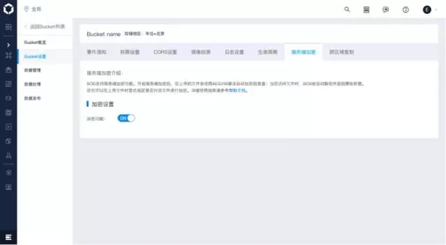 為進(jìn)一步方便用戶使用該功能,我們還在百度云前端管理控制臺(tái)實(shí)現(xiàn)了Bucket加密開(kāi)關(guān)功能,即當(dāng)用戶打開(kāi)此開(kāi)關(guān)后,該Bucket的新增數(shù)據(jù)都會(huì)自動(dòng)執(zhí)行加密,進(jìn)一步提高了易用性。