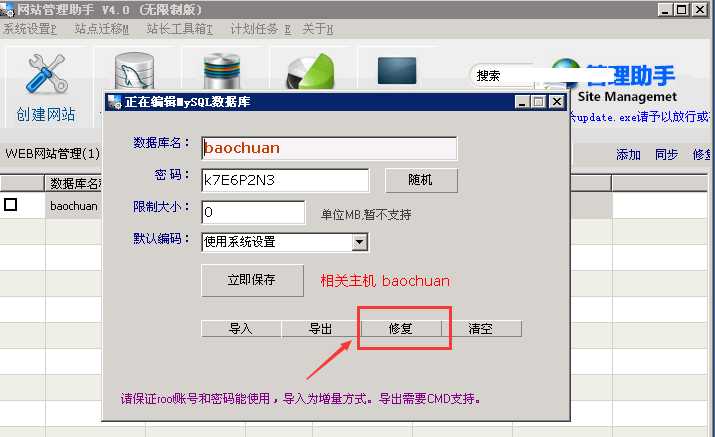 打開管理助手,打開mysql數據庫選項,雙擊需要修復的數據庫,點擊修復按鈕修復。