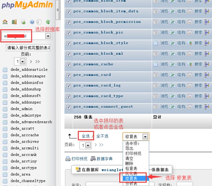 在服務器里面訪問http://localhost/phpmyadmin/(wdcp系統可用:http://IP:8080/phpmyadmin)或者訪問http://mysql.myhostadmin.net/登陸自己的數據庫,點擊左邊需要修復的數據庫。右邊會列出數據庫所有表,選擇損壞的表或者將頁面拉到最下面,點擊全選,下拉框中選擇修復。