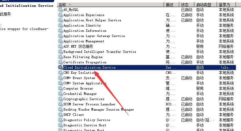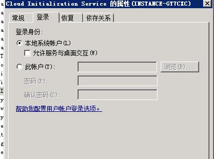 1、開始-管理工具-服務管理器-配置-服務-Cloud Initialization Service –選擇“本地系統賬戶”且不勾選允許服務與桌面交互。