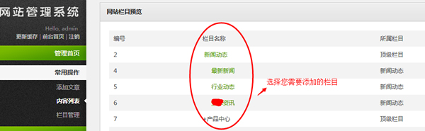 1.首先我們進入后臺找到自己需要更新的欄目,經常會遇到客戶添加的時候一個不小心就看錯了欄目,最后添加完了怎么也是不更新,因為您選錯了位置當然不會更新了。