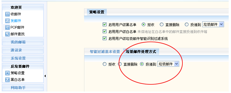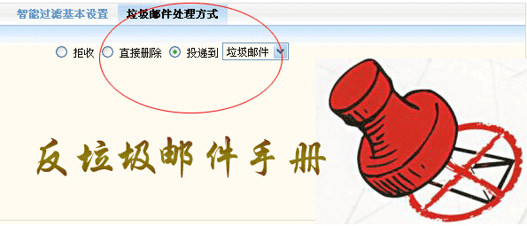 2.點(diǎn)“垃圾郵件處理方式”,根據(jù)您的需要選擇, 如果您的每一封郵件都非常重要,絕對(duì)不能誤殺一封郵件,可以選擇為處理方式為“投遞到垃圾郵件箱”。這樣收到系統(tǒng)認(rèn)為的垃圾郵件后,會(huì)自動(dòng)保存在“垃圾郵件箱”里面,您通過(guò)Foxmail接收的時(shí)候,不會(huì)接收這些垃圾郵件。 如果想看看里面有沒(méi)有正常的郵件, 只需要通過(guò)Webmail登錄到,點(diǎn)“垃圾郵箱”進(jìn)行查看即可,如果沒(méi)有正常的郵件,可以在登錄頁(yè)點(diǎn) 垃圾筒圖標(biāo)將垃圾郵箱中的全部垃圾一鍵刪除。 如果誤殺一兩封也沒(méi)有關(guān)系,為了省事,也可以選擇為“拒收”或“直接刪除”,選擇為“拒收”的話,對(duì)方在發(fā)垃圾郵件給您時(shí)會(huì)收到提示“您所發(fā)的郵件被判斷為垃圾郵件”
