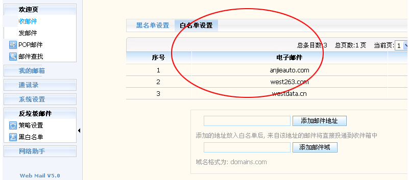 3.如果您有些正常郵件也被當(dāng)垃圾郵件過(guò)濾了,可以點(diǎn)“黑白名單”,將您經(jīng)常用的郵箱或者郵箱的域名直接加入白名單,這樣就再也不怕被誤殺了。