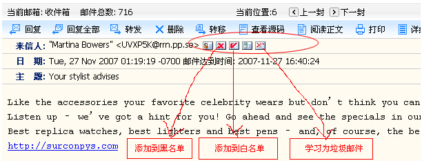 4.在閱讀每封郵件的時(shí)候,點(diǎn)相應(yīng)的按鈕可以直接添加入黑名單,白名單或進(jìn)行“反垃圾郵件學(xué)習(xí)”,經(jīng)常多次反垃圾郵件學(xué)習(xí)后,可以更準(zhǔn)確地過(guò)濾垃圾郵件。