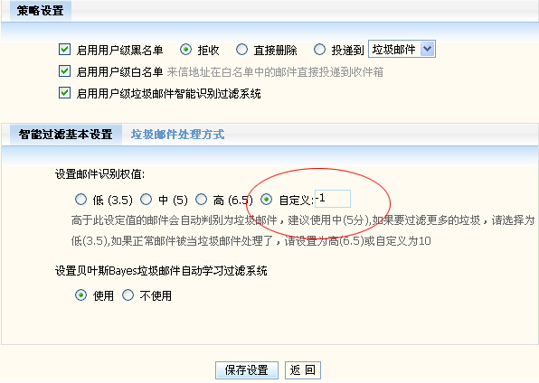 默認(rèn)權(quán)值是5分, 我司對(duì)所有英文郵件給予4.5分。 如果要過(guò)濾更多的英文垃圾郵件,建議設(shè)置為3.5分。如果您是做外貿(mào)的,不能漏過(guò)一封英文郵件的話,建議保持初始配置5分。