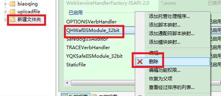方法二:為這個(gè)目錄的"處理程序映射"中,刪除主機(jī)衛(wèi)士的安全處理程序"QHWafIISModule_32bit"或者QHWafIISModule_64bit。如果有安全狗之類的防護(hù)軟件也有類似的問題,其模塊也要?jiǎng)h除。如下圖,"新建文件夾"是我的只有讀取權(quán)限文件夾。