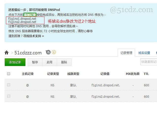 要將域名的解析權交給DNSPod,你必須將原有的DNS記錄修改為DNSPod提供的,注意是用DNSPod的DNS替換掉原有的,不能保留其他記錄。