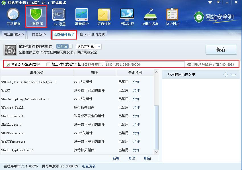 在危險組件防護界面上,我們可以看到軟件默認勾選了禁止對外發送UDP包,勾選該選項是基于IIS的網站組件模塊。一般情況下通過w3wp.exe進程發送UDP包將會被網站安全狗阻止,UDP數據包不會通過服務器進行對外發送,從而出現帶寬占用的情況。
