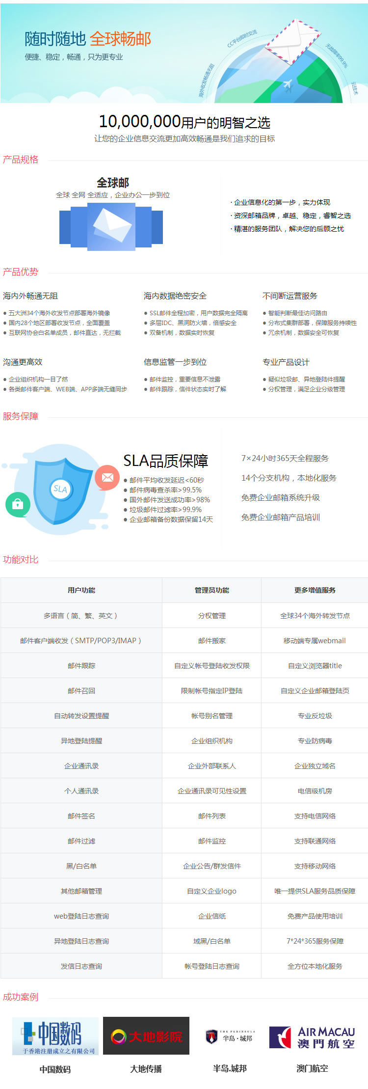 全球郵是百度云首推的企業郵箱,并以企業郵箱為切入點,以統一通訊錄(組織架構)為核心,面向企業用戶提供融合通訊以及文檔管理服務的高效穩定安全的企業郵箱產品。專注企業郵箱19年,在全球部署34個海外轉發節點,國內全網覆蓋,全終端適應全面支持多樣化移動辦公,已為超過50萬家企事業單位用戶提供高效穩定專業的郵箱服務