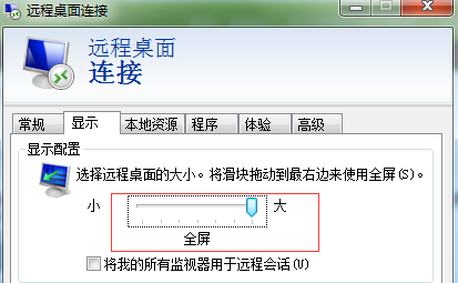 第二步:選擇顯示按鈕,調(diào)整屏幕為大。調(diào)整完后,點(diǎn)擊連接遠(yuǎn)程桌面