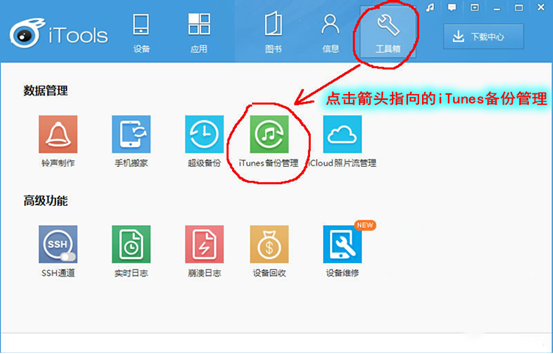 3,接下來安裝并打開iTools軟件,點擊窗口上方最右邊的“工具箱”,再點擊“iTunes備份管理”。