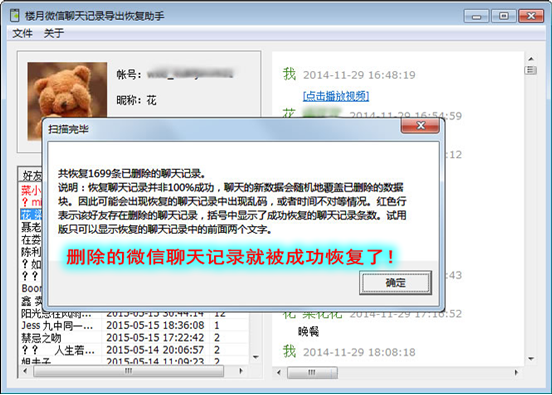 說明:如果聊天記錄特別多的話(尤其是群聊數據較多),則恢復是需要比較久的時間的,請耐心等待。